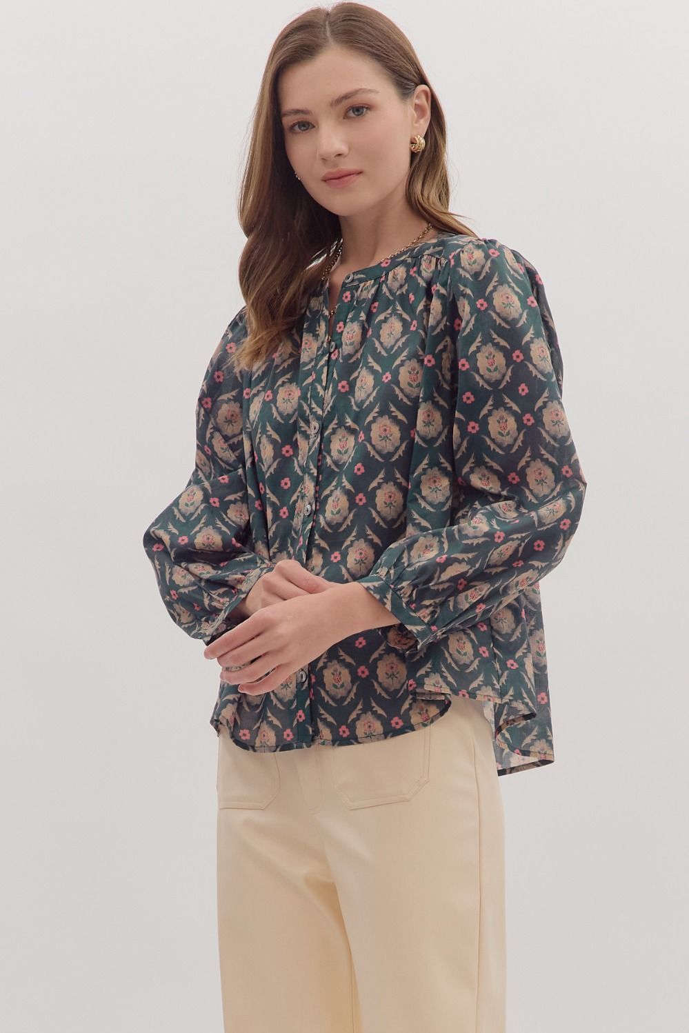 The Ciara Shirt brings a fresh burst of botanical charm with its playful print and breezy, semi-sheer fabric. Featuring a gathered yoke and long sleeves with button-down style, this lightweight woven top adds a flirty touch to any outfit while keeping things cool and comfortable. Perfect for layering or wearing on its own, it’s your go-to for effortless, whimsical style.